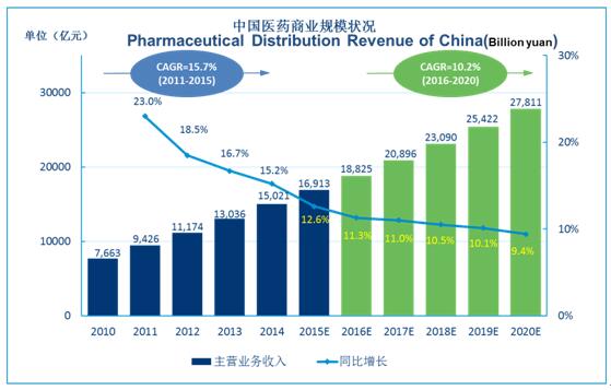 中国医药商业市场规模从2011年的9436亿元增长至2015年的16613亿元,“十二五”期间其复合增长率约为15.7%;从未来趋势来看,全国医药商业增长将明显放慢,预计“十三五”期间其复合增长率仅为10.2%
