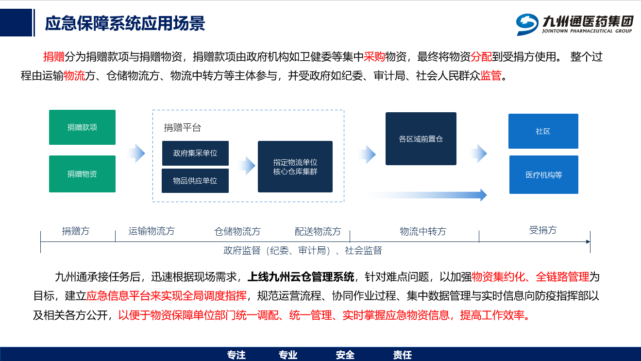 应急保障问题说起来简单,将捐赠物资进行分类,用系统管理,让所有参与方知道物资流向,通过物流配送到受赠方,但实际操作很难。由于是捐赠物资,所以同时要接受政府(纪委、审计局)和社会监督。